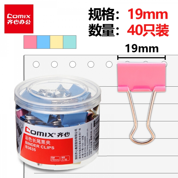 齊心B3635彩色長尾票夾19mm*40只/筒*12