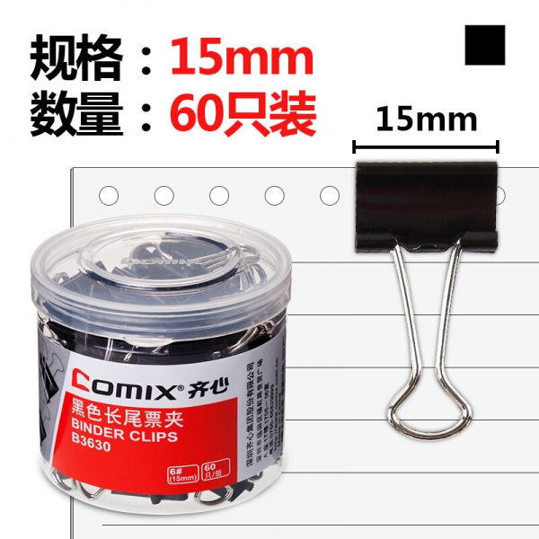 齊心B3630黑色強力長尾票夾15mm*60只/筒