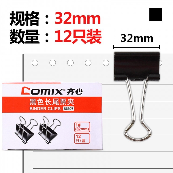 齊心B3607黑色長尾票夾32mm*12只/盒*12