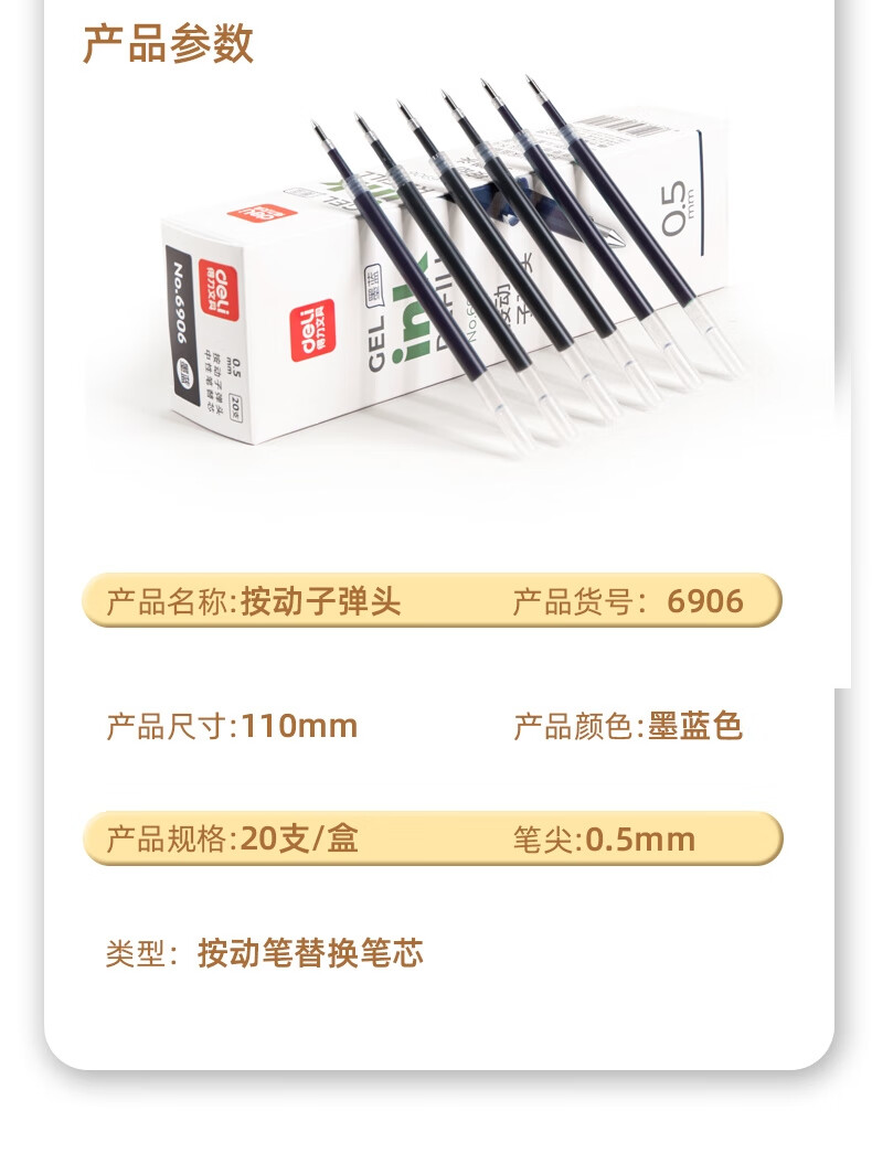 得力6906按鍵式中性筆替芯0.5mm墨藍色*20支