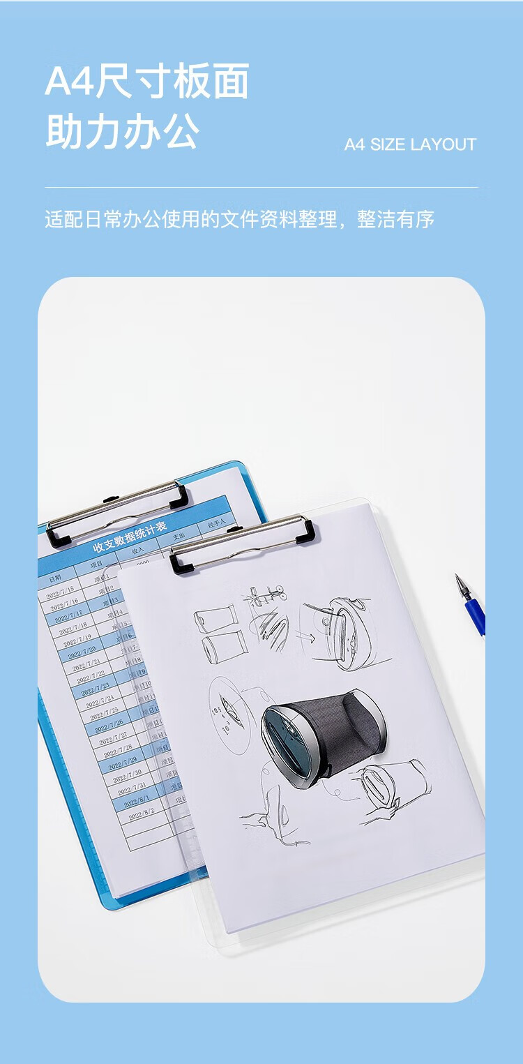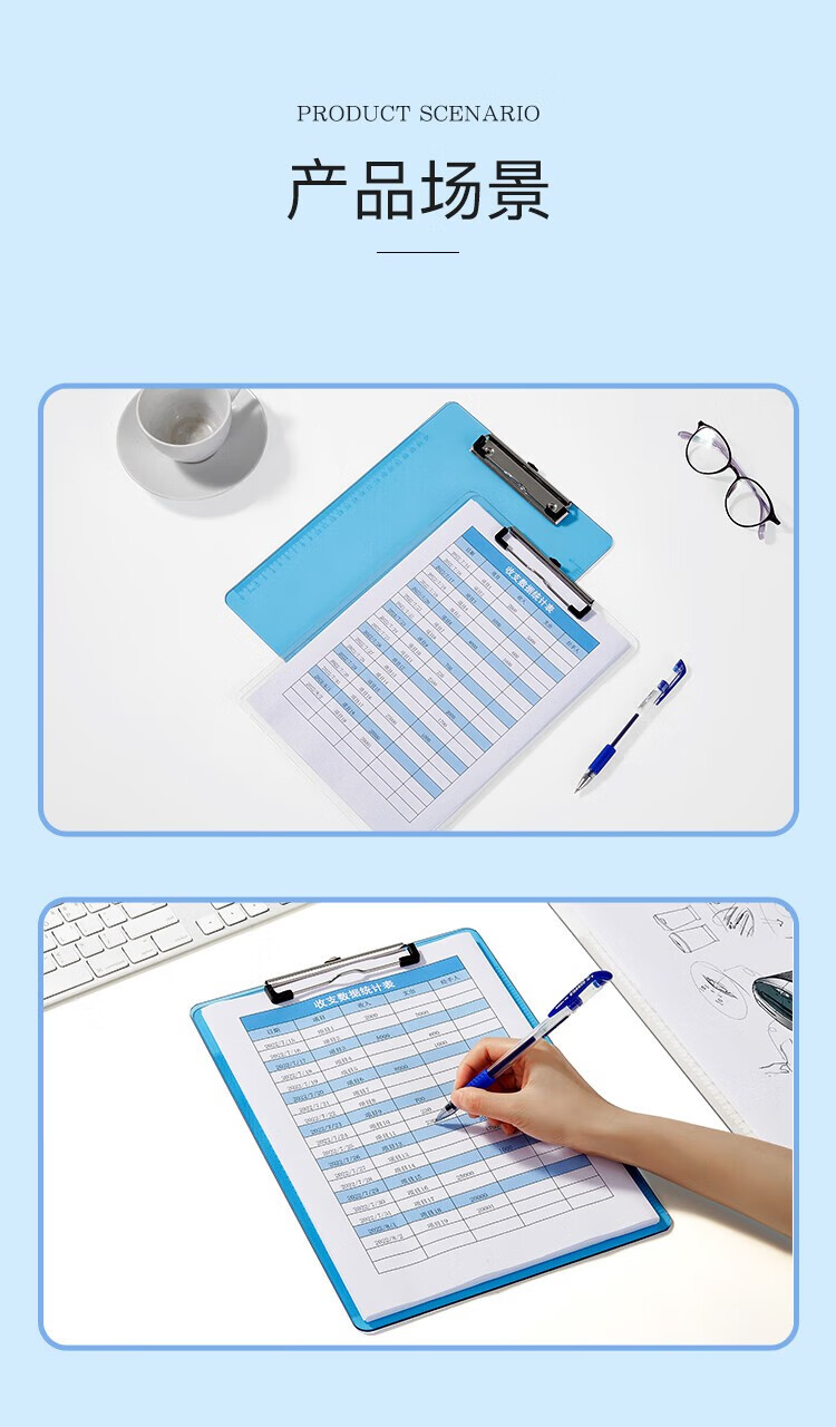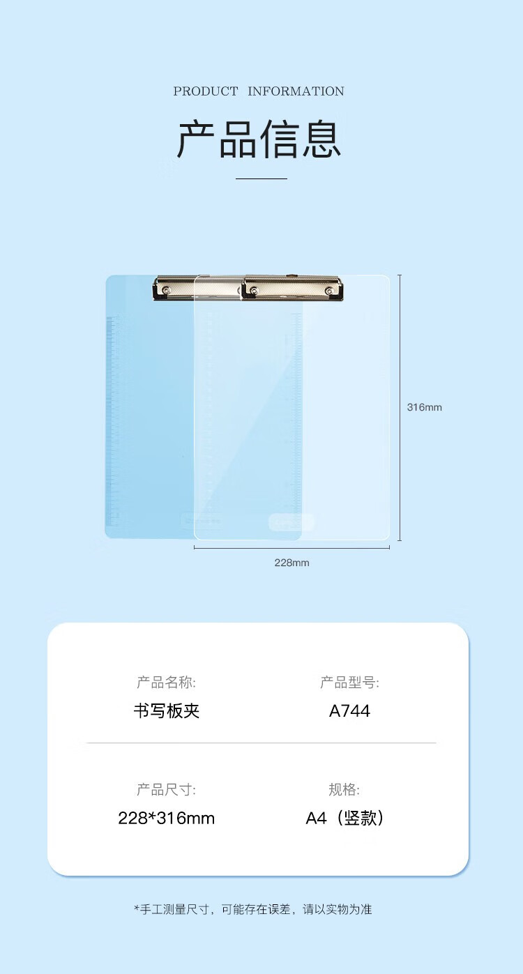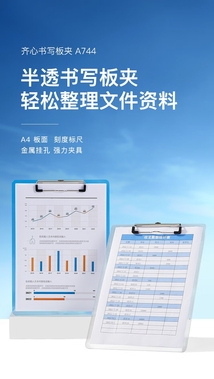 齊心A744藍色書寫板夾 A4豎帶刻度*12