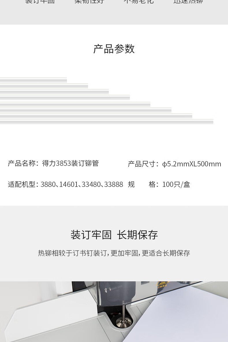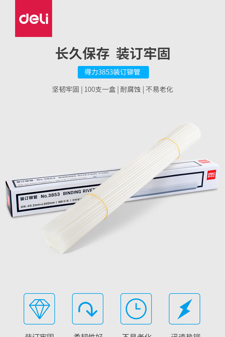 得力3853財務裝訂機鉚管(100支/盒)Φ5.2mm*500mm