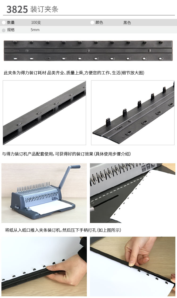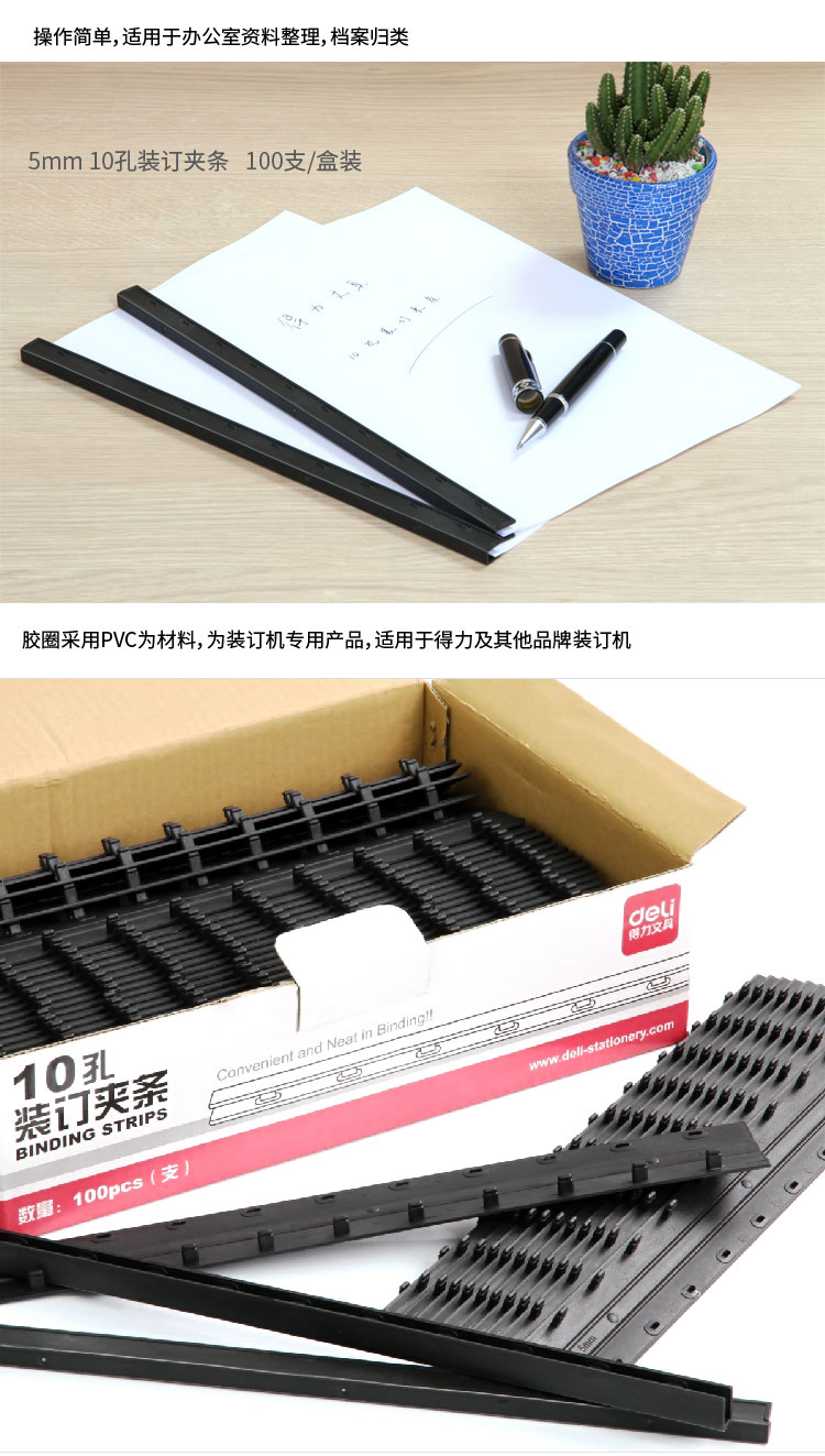 得力3825-10孔裝訂夾條(黑)300*5mm(100支/盒)