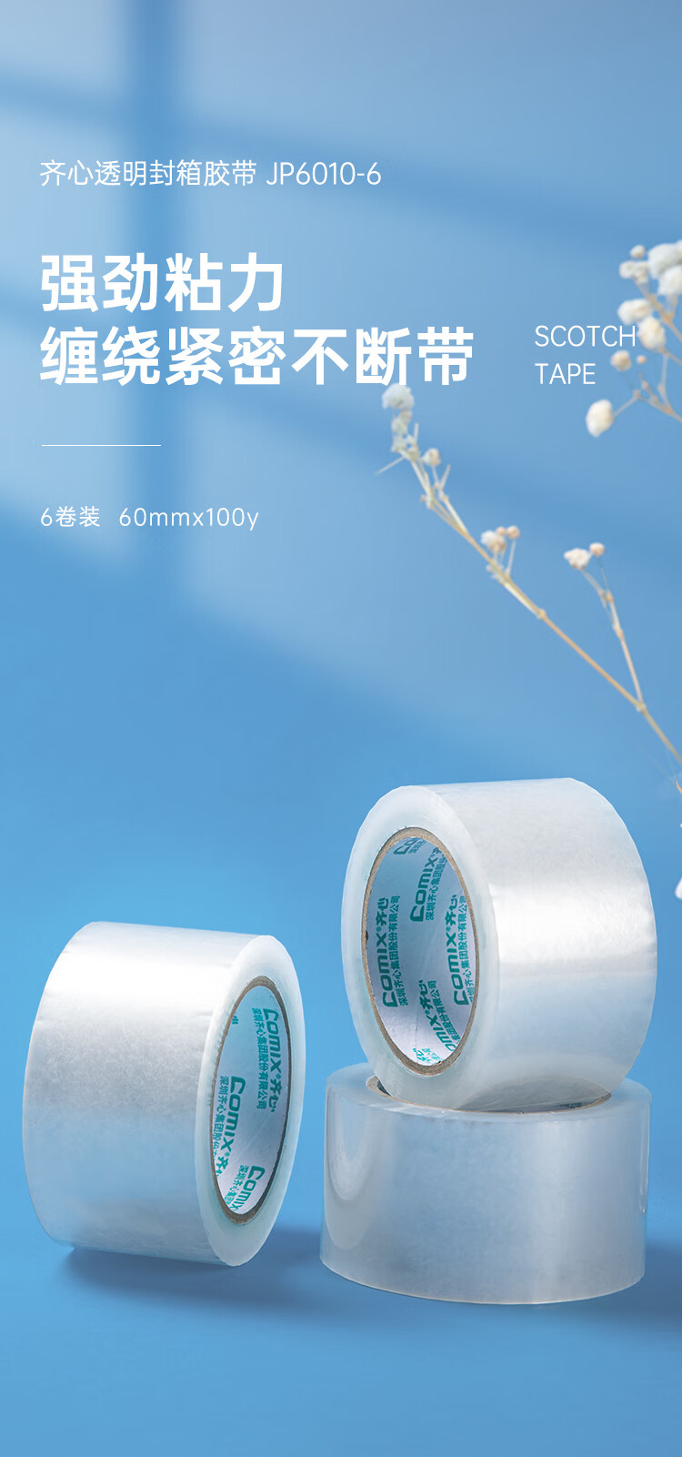齊心JP6010-6透明封箱膠帶60mm*100y*6卷*3