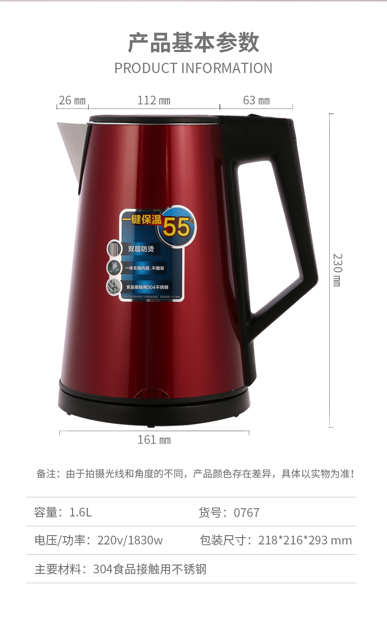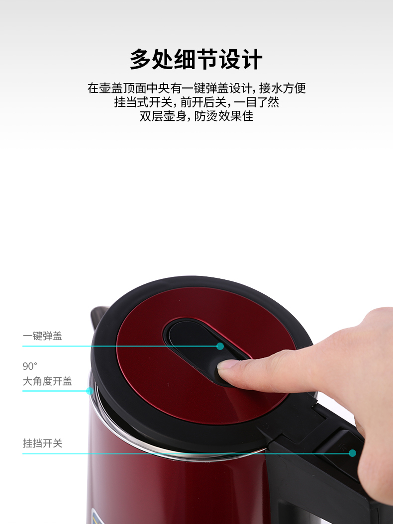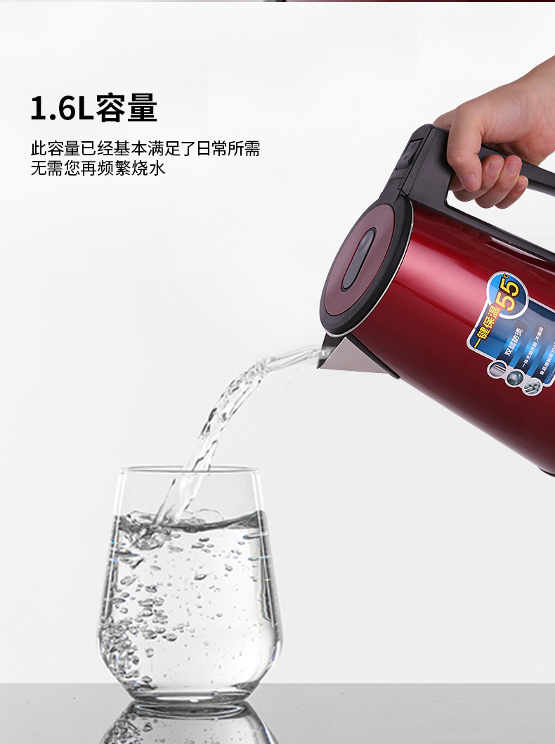 得力0767電熱水壺(紅)雙層不銹鋼1.7L