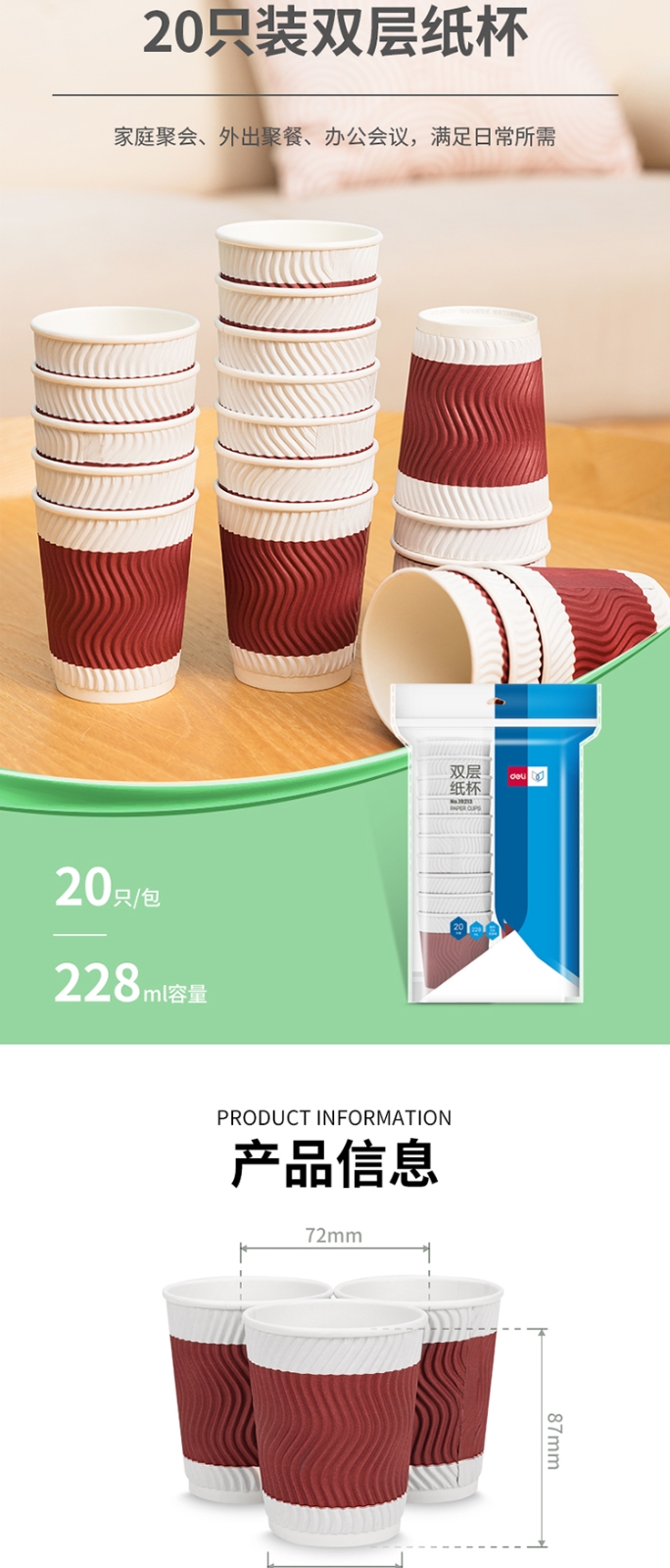 得力19213雙層紙杯(228ml)(木漿紙)(紅色)(20只/袋)