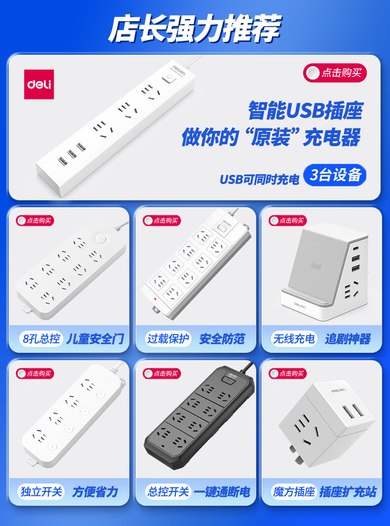 得力18170-03插座_8組_3米_PVC袋裝(白)