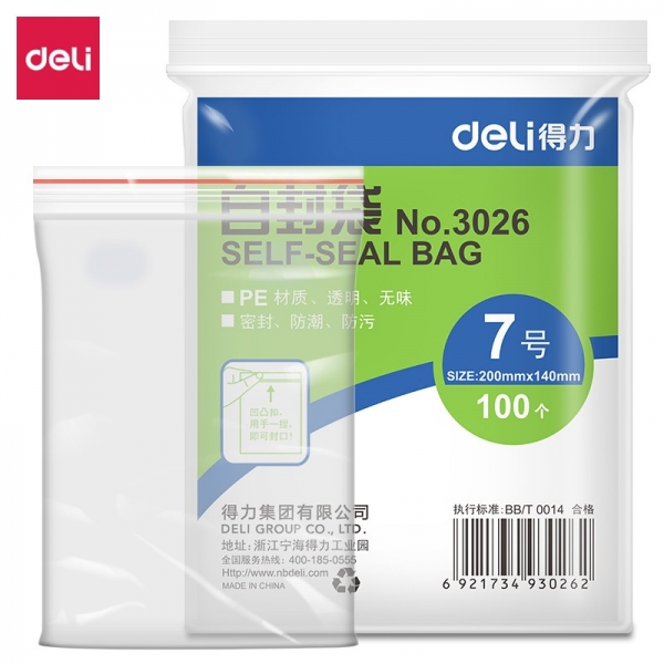 得力3026自封袋(透明)-7號(100個/包)200x140*0.04mm