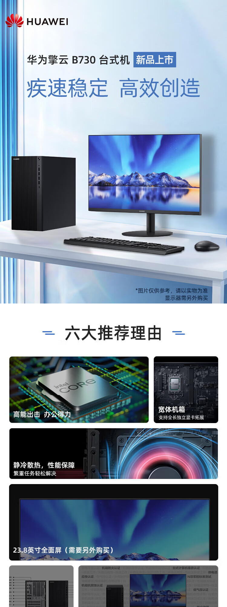 華為擎云B730-K5651B臺式電腦(Inteli5-12400+16GB+512GB)有線鍵鼠/16.6L/WIN11家庭版/23.8顯示器