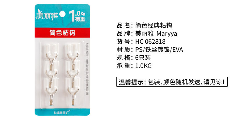 美麗雅HC062818簡(jiǎn)色經(jīng)典小粘鉤6個(gè)/板
