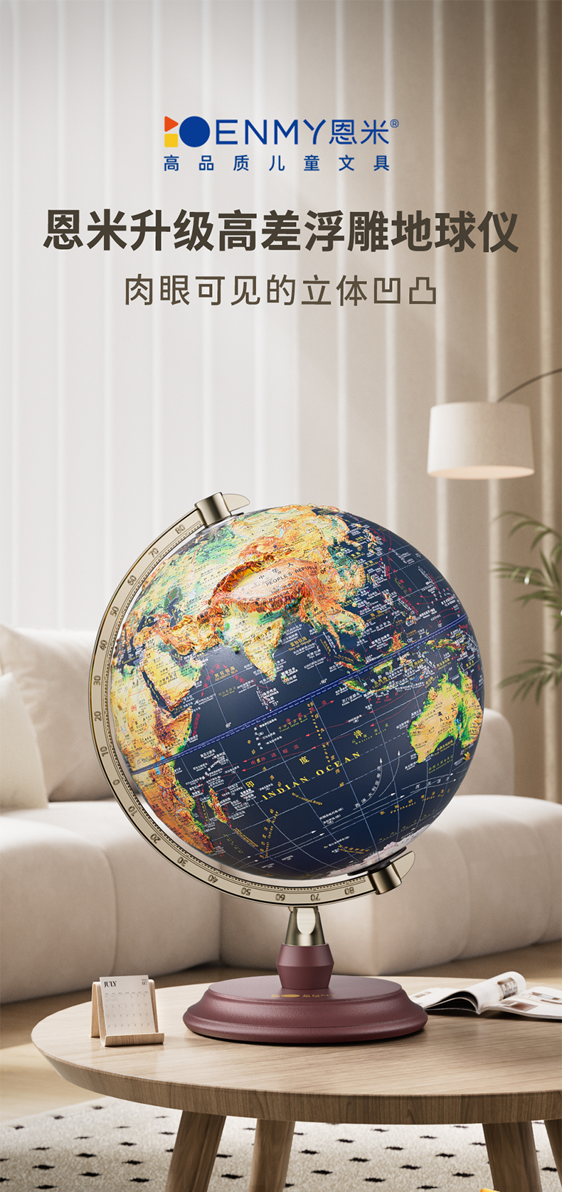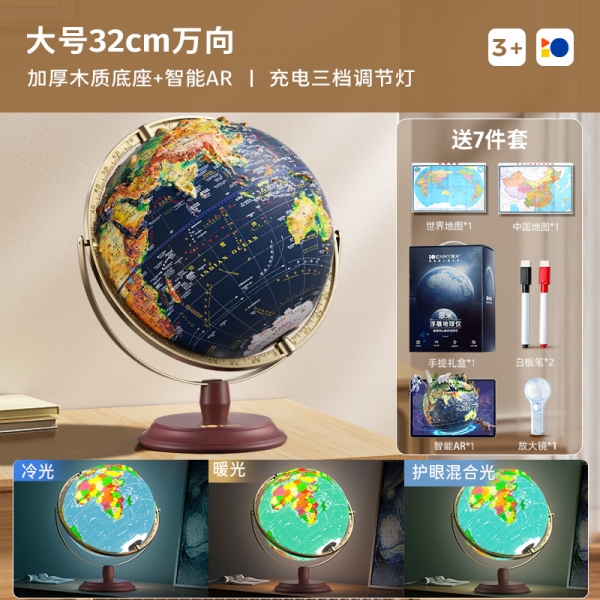 恩米科技YSE33-木質底座升級高差浮雕地球儀-32cm-青古銅萬向刻度-三檔燈帶AR-禮盒裝